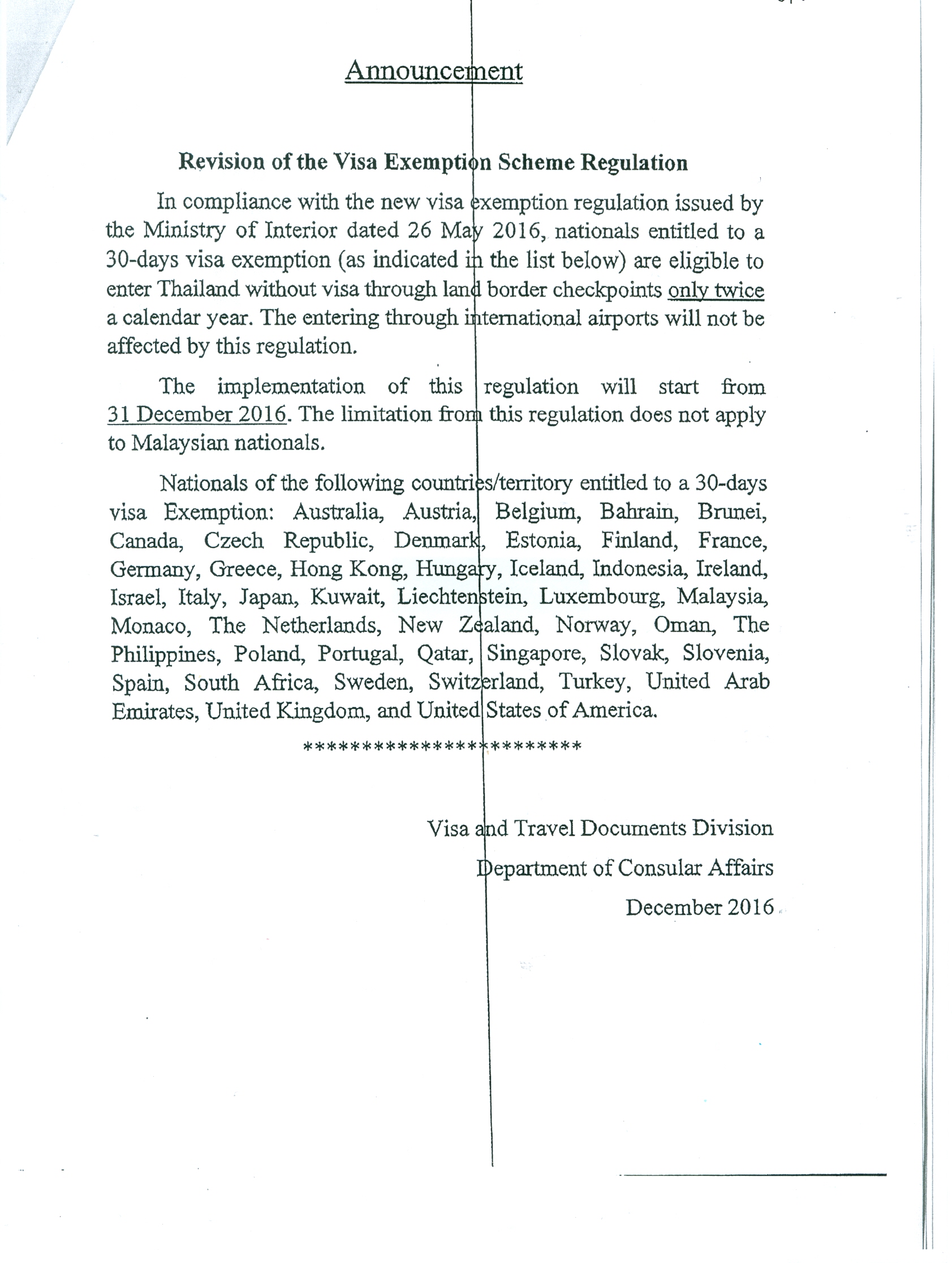 ด้วยสถานกงสุลใหญ่ ณ เมืองชิงต่าว ได้รับแจ้งจากกระทรวงการต่างประเทศ เรื่อง กระทรวงมหาดไทยได้ออกกฎกระทรวงเปลี่ยนแปลงหลักเกณฑ์การอนุญาตให้ชาวต่างชาติที่ได้รับสิทธิยกเว้นการตรวจลงตราเพื่อการท่องเที่ยวเป็นระยะเวลา 30 วัน (ผ.30) ซึ่งจะเดินทางเข้าประเทศไทยผ่านทางช่องทางอนุญาตของด่านตรวจคนเข้าเมืองหรือด่านพรมแดนที่เป็นเขตติดต่อกับพรมแดนทางบก สามารถเข้ามาในประเทศไทยด้วยการยกเว้นการตรวจลงตราได้ไม่เกิน 2 ครั้งต่อปีปฏิทิน ยกเว้นบุคคลสัญชาติมาเลเซีย โดยจะเริ่มมีผลบังคับใช้ตั้งแต่วันที่ 31 ธันวาคม 2559 เป็นต้นไป
