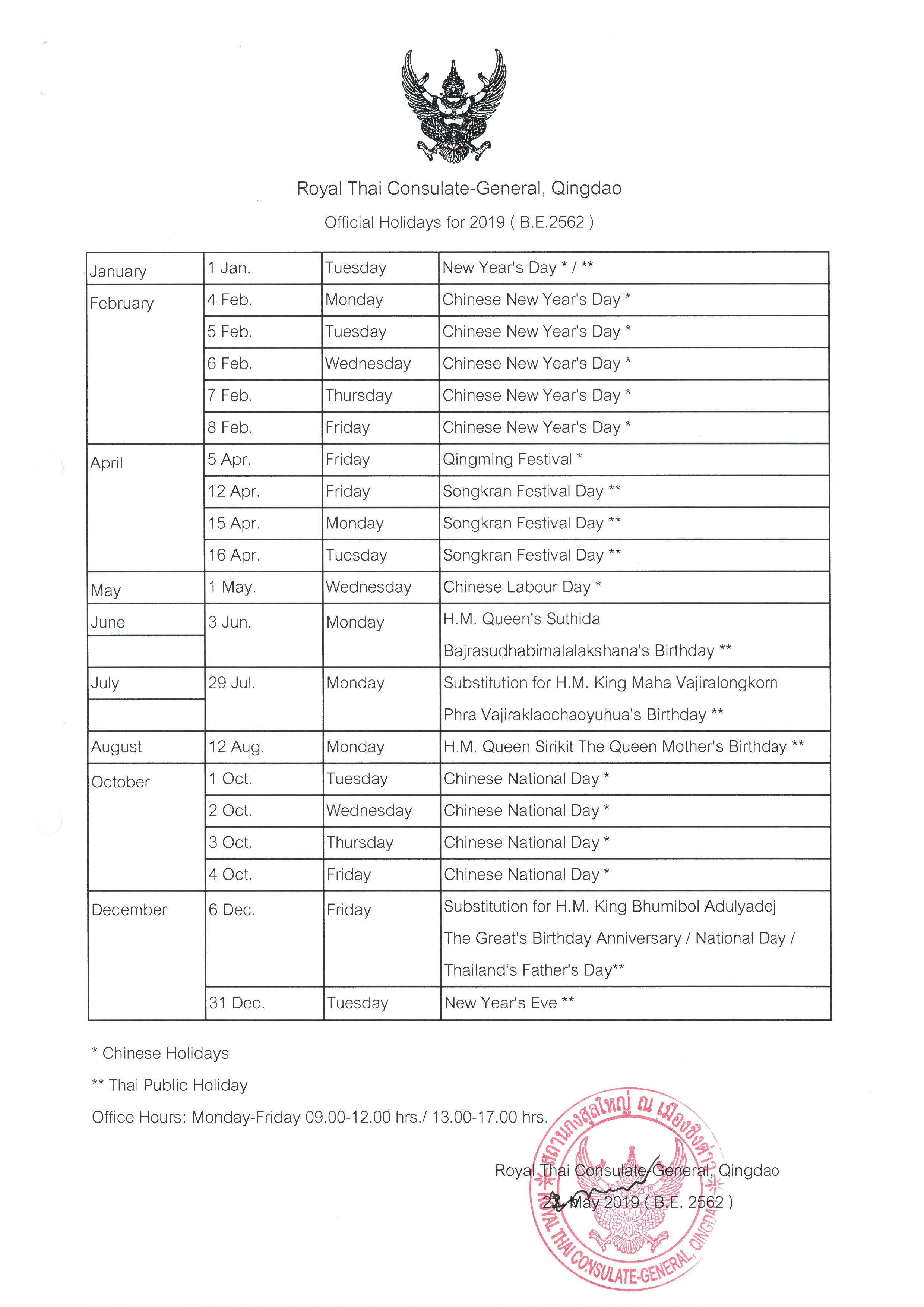 ประกาศวันหยุดสถานกงสุลใหญ่ ณ เมืองชิงต่าว ประจำปี 2562
